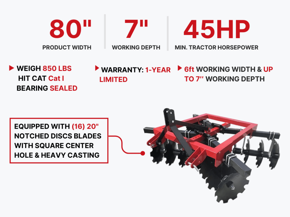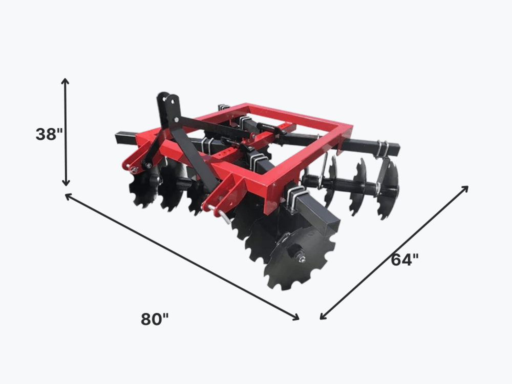 Wolverine disc harrows are made by strong frame tubing, reinforced metal gangs, high strength castings, and heavy-duty sealed bearing to rip the soils for planting easily, qualified heat-treated disc blades for the long and lasting time under application. Front and rear reinforced gang is adjustable for different angles. Category 1 and or 2 quick hitch hookup is available. Durable, corrosion-resistant powder coat finished is standard.